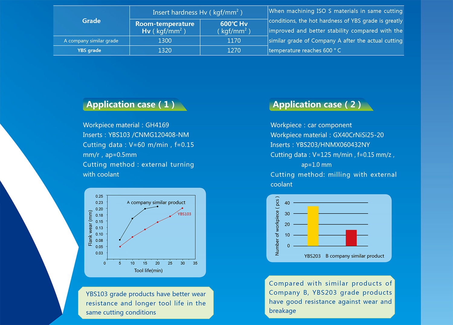 • The YBS series offer the perfect solutions for difficult-to-cut materials, especially in HRSA(Heat resistant super alloy) materials such as nickel-based alloy and titanium alloy.